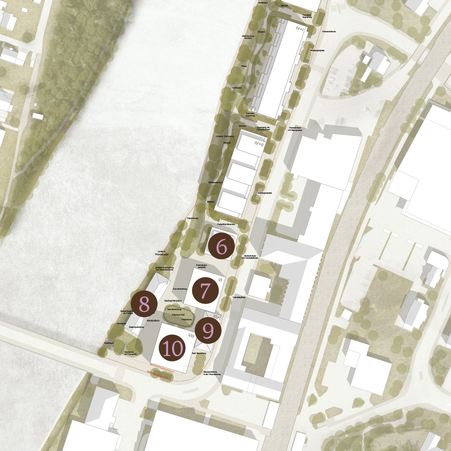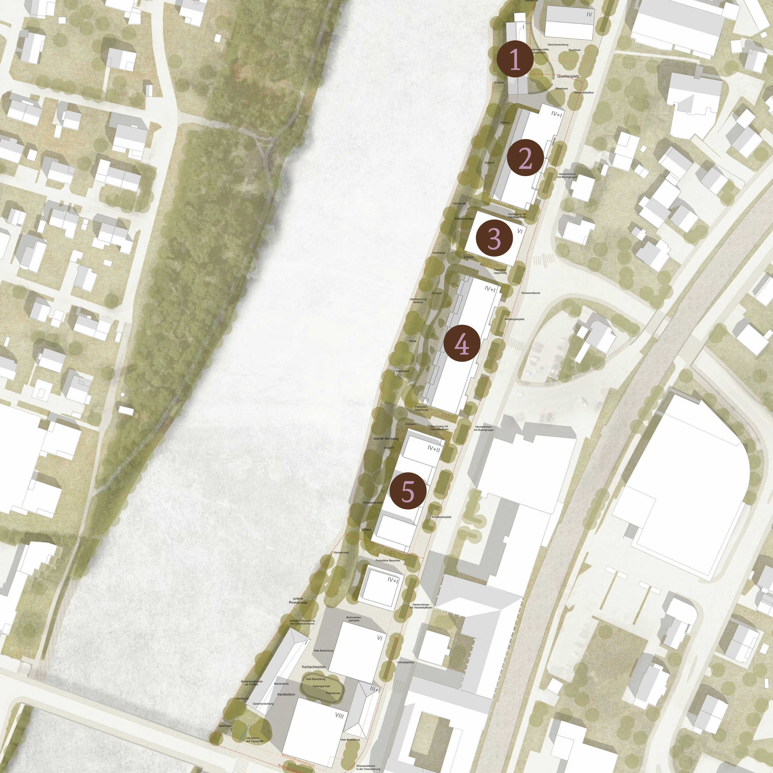 Während der vordere Teil urban geprägt ist, entstehen im mittleren Bereich hochwertige Miet- und Eigentumswohnungen direkt am Fluss. Locker angeordnete Häuserzeilen und ein markanter sechsgeschossiger Bau schaffen einen ruhigen, naturnahen Wohnraum.
